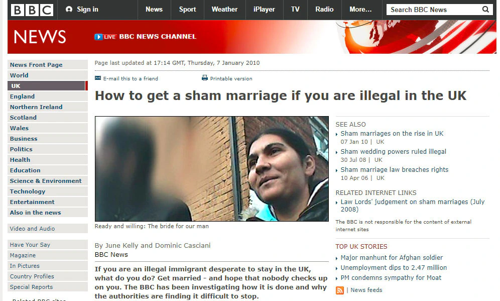 An article from a BBC correspondent investigated sham marriages in the UK and how illegal immigrants used it as their first line of defense.