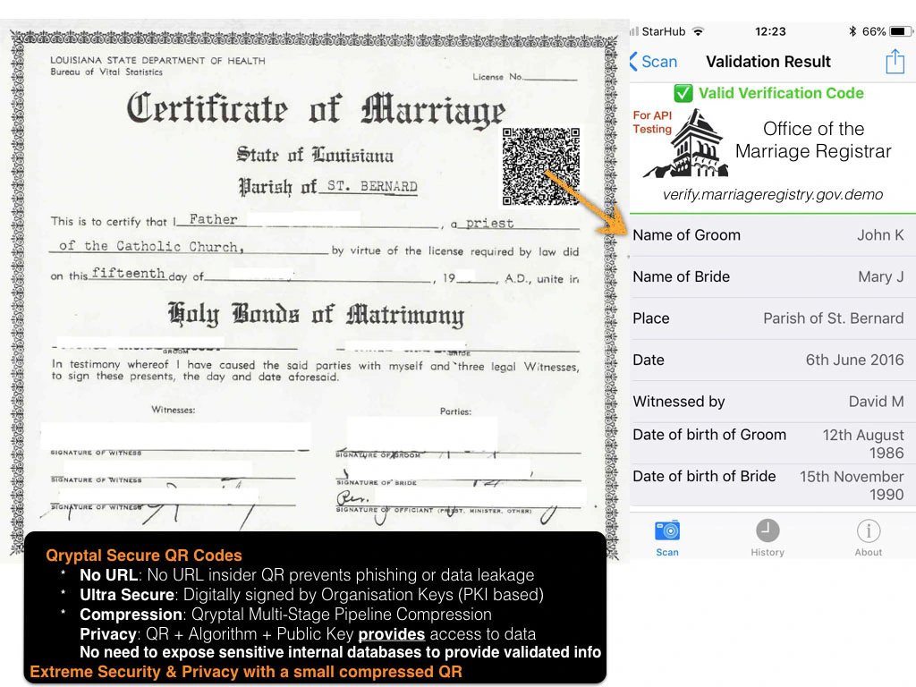 Have a look at a sample marriage certificate with details captured in a tamper proof QR code developed by Qryptal