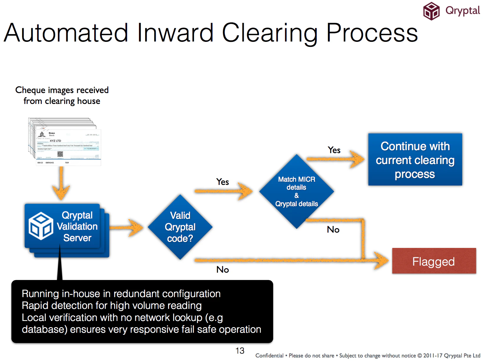 Cheques that have been secured with Qryptal can easily be validated with Qryptal’s Validation Server as part of the Automated Inward Clearing process.