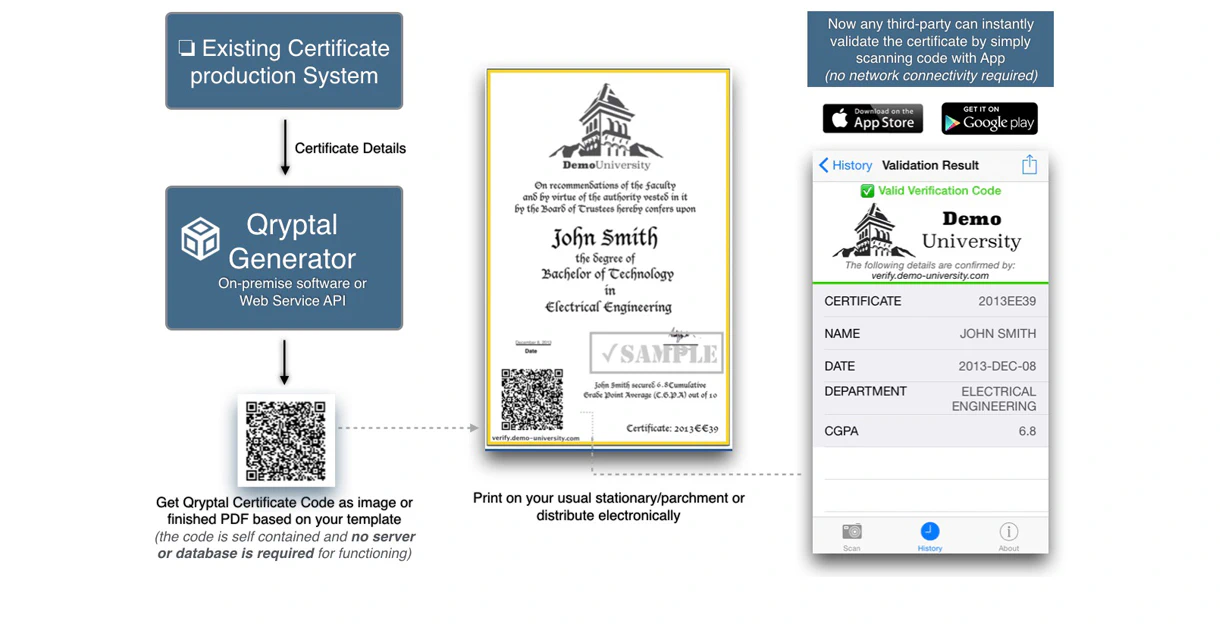 Qryptal is a truly multi-purposed design, suitable for educational, corporate or government environments. It is a light weight system which can be easily integrated with your existing document production processes. The best part is that our mobile Apps make it very easy for any person to instantly validate both physical and electronic documents.